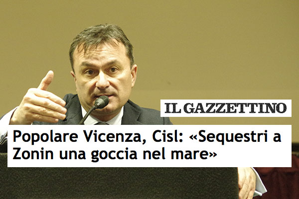«Una goccia nel mare dei suoi faraonici compensi da presidente della Popolare di Vicenza, ecco cosa sono i 346 mila euro sequestrati a Zonin. Adesso la politica ci spieghi perché non ha mai frenato le scandalose retribuzioni dei vertici delle banche». Lo afferma il segretario generale di First Cisl, Giulio Romani, alla luce dell’analisi compiuta dall’Ufficio Studi del sindacato sulle retribuzioni dei top manager della banca vicentina a partire dal 2005. «I soldi che gli sono stati sequestrati dal tribunale – aggiunge – corrispondono appena al 34% del milione abbondante di euro che Zonin ha incassato solo nel 2015 come ultimo stipendio in Popolare di Vicenza. Nel 2014 si era concesso 1,1 milioni. In entrambi i casi la cifra era attorno al 20% dei compensi totali degli amministratori».