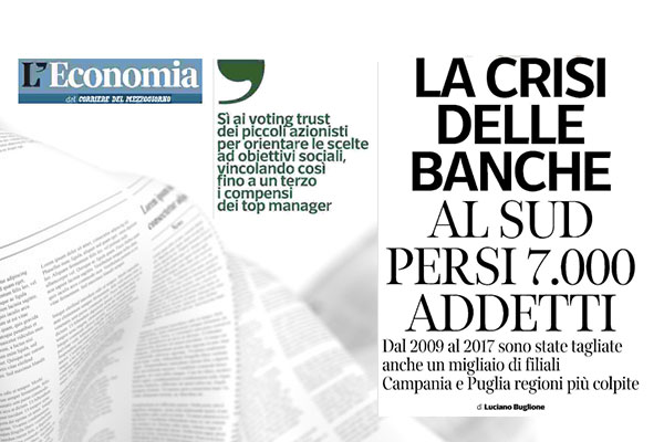 “Nonostante i grandi disastri bancari – scrive Luigi Buglione sul Corriere del Mezzogiorno -, esplosi nel Nord Est con la Popolare di Vicenza, Veneto Banca e Carife e nel Centro con la Cassa di Rimini e Cesena, chi paga le maggiori conseguenze da quando è scoppiata la crisi finanziaria è ancora una volta il Mezzogiorno, che in 8 anni, dal 2009 al 2017, ha bruciato oltre 7 mila posti di lavoro”.