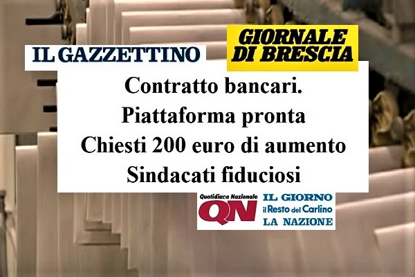“Contratto dei bancari: i sindacati sono fiduciosi” titola “L’Eco di Bergamo”. “Contratto dei bancari, via ibridi e Jobs Act” è invece il titolo de “Il Gazzettino”. Punta invece la sua attenzione sulle rivendicazione economica dei lavoratori il “Quotidiano Nazionale” che riunisce “Il Giorno”, “Il Resto del Carlino”, “La Nazione”. Questo il titolo “Contratto bancari. Verso l’aumento di 200 euro”. “Il Giornale di Brescia” informa che “La piattaforma è pronta per 300mila lavoratori”.
