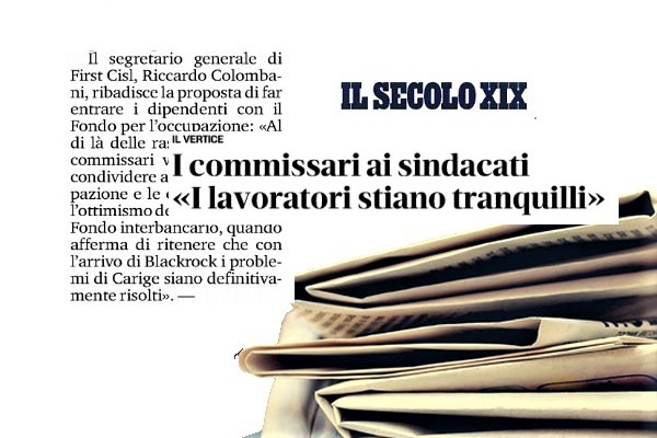 La svolta in Carige avanza tra speranze e timori di drastica riduzione dei posti di lavoro. Le organizzazioni sindacali sono molto preoccupate. “Il Secolo XIX” si fa carico dei timori ma con un titolo rassicurante: “I commissari ai sindacati. I lavoratori stiano tranquilli”. Nel servizio viene riportata la posizione dei commissari straordinari Fabio Innocenzi, Pietro Modiano, Raffaele Lener che, incontrando le organizzazioni sindacali, hanno “smentito di fatto tutto, dai temuti duemila esuberi aggiuntivi di Blackrock al taglio delle retribuzioni, al dimezzamento degli sportelli”.