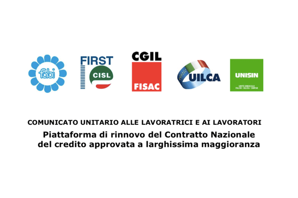 “Nella mattinata di venerdì 31 maggio abbiamo presentato all’Abi la Piattaforma rivendicativa unitaria per il rinnovo del Contratto Nazionale del Credito, approvata a larghissima maggioranza dalle Lavoratrici e dai Lavoratori durante le circa mille assemblee svoltesi in maniera capillare in tutta Italia. Questi i risultati della consultazione: 99,31% di voti favorevoli 0,18% di voti contrari e 0,51% di astensioni.”: lo annunciano in un comunicato unitario i Segretari generali di Fabi (Lando Maria Sileoni), First Cisl (Riccardo Colombani), Fisac Cgil (Giuliano Calcagni), Uilca Uil (Massimo Masi) e Unisin (Emilio Contrasto)