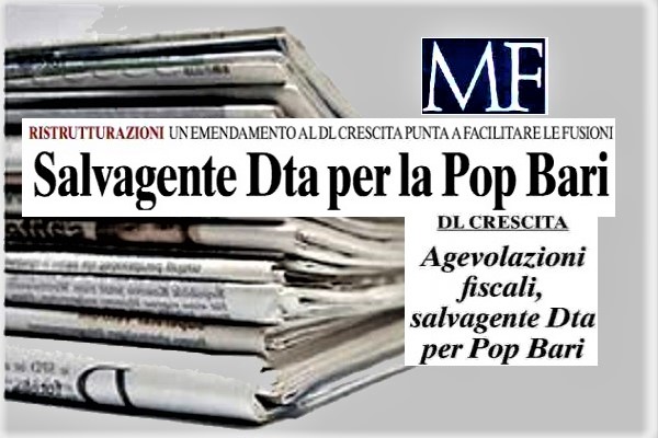 Un emendamento al decreto legge sulla crescita potrebbe aiutare la Banca Popolare di Bari a risolvere i suoi problemi. MF Milano Finanza scrive in proposito “Favorire le aggregazioni tra le banche del Mezzogiorno facendo leva sulle agevolazioni fiscali”.