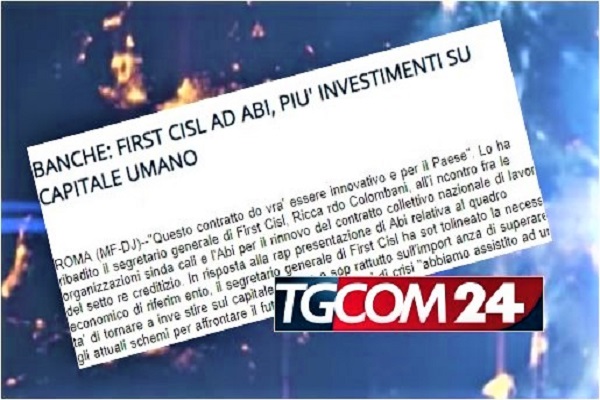 TgCom24 torna sulla trattativa per il rinnovo del contatto collettivo nazionale dei lavoratori delle banche titolando il suo servizio “Banche: First Cisl ad Abi, più investimenti sul capitale umano”. La testata di all news evidenzia come per il segretario generale di First Cisl, Riccardo Colombani, “questo contratto dovrà essere innovativo e per il Paese”. L’affermazione è una riposta alla rappresentazione fornita da Abi sul quadro economico di riferimento. Colombani aggiunge che si avverte “la necessità di tornare a investire sul capitale umano e soprattutto sull’importanza di superare gli attuali schemi per affrontare il futuro”.