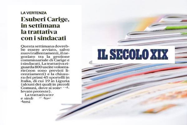 Parte la trattativa tra azienda e sindacati sull’occupazione in Carige. A darne notizia è Il Secolo XIX che titola: “La Verteza. Esuberi Carige, in settimana la trattativa con i sindacati”. Questa settimana – si legge sul quotidiano genovese – dovrebbe essere avviato, salvo nuovi rallentamenti, il negoziato tra la gestione commissariale di Carige e i sindacati. La trattativa riguarda 800 uscite volontarie (non sono previsti licenziamenti) e la chiusura dei primi 45 sportelli in Italia, di cui 19 in Liguria (alcuni dei quali in piccoli Comuni, dove si sono sollevate proteste).