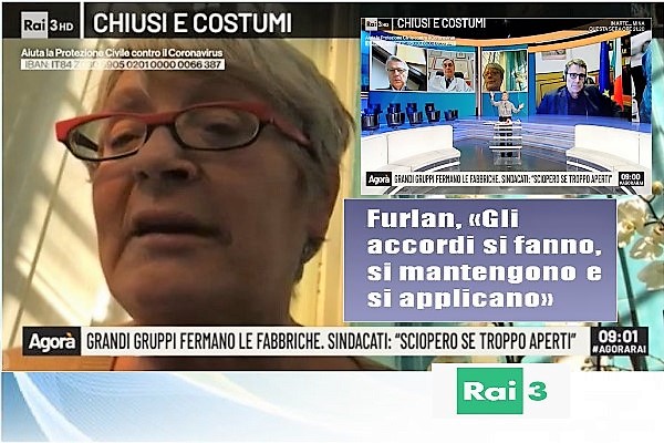 La conduttrice Serena Bortone ha chiesto di cosa siano preoccupati i sindacati. «La questione è proprio quella degli accordi che si fanno e poi si mantengono e si applicano. Sabato, con il Presidente del Consiglio, il Governo e le parti sociali, avevamo insieme condiviso il fatto che tutto ciò che non era indispensabile nella produzione, era necessario fermarlo. Non farlo comporta che continueremo ad avere le metropolitane e gli autobus pieni».