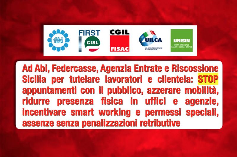Le richieste di Fabi, First Cisl, Fisac Cgil, Uilca e Unisin ad Abi, Federcasse, Agenzia Entrate e Riscossione Sicilia per tutelare lavoratori e clientela: stop pressioni commerciali e appuntamenti con il pubblico, azzerare mobilità, ridurre presenza fisica negli uffici e nelle agenzie, incentivare smart working e permessi speciali, assenze senza penalizzazioni retributive