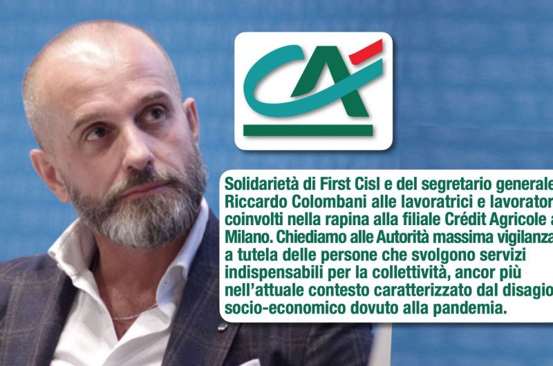 Solidarietà di First Cisl e del segretario generale Riccardo Colombani alle lavoratrici e lavoratori coinvolti nella rapina alla filiale Crédit Agricole a Milano. Chiediamo alle Autorità massima vigilanza, a tutela delle persone che svolgono servizi indispensabili per la collettività, ancor più nell’attuale contesto caratterizzato dal disagio socio-economico dovuto alla pandemia.