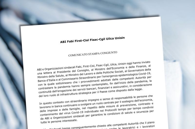 La lettera di Abi, Fabi, First Cisl, Fisac Cgil, Uilca e Unisin inviata al Presidente del Consiglio, al Ministro dell’economia e delle finanze, al Ministro della salute, al Ministro del lavoro e delle politiche sociali, al Governatore della Banca d’Italia e al Commissario straordinario per l’emergenza epidemiologica Covid-19