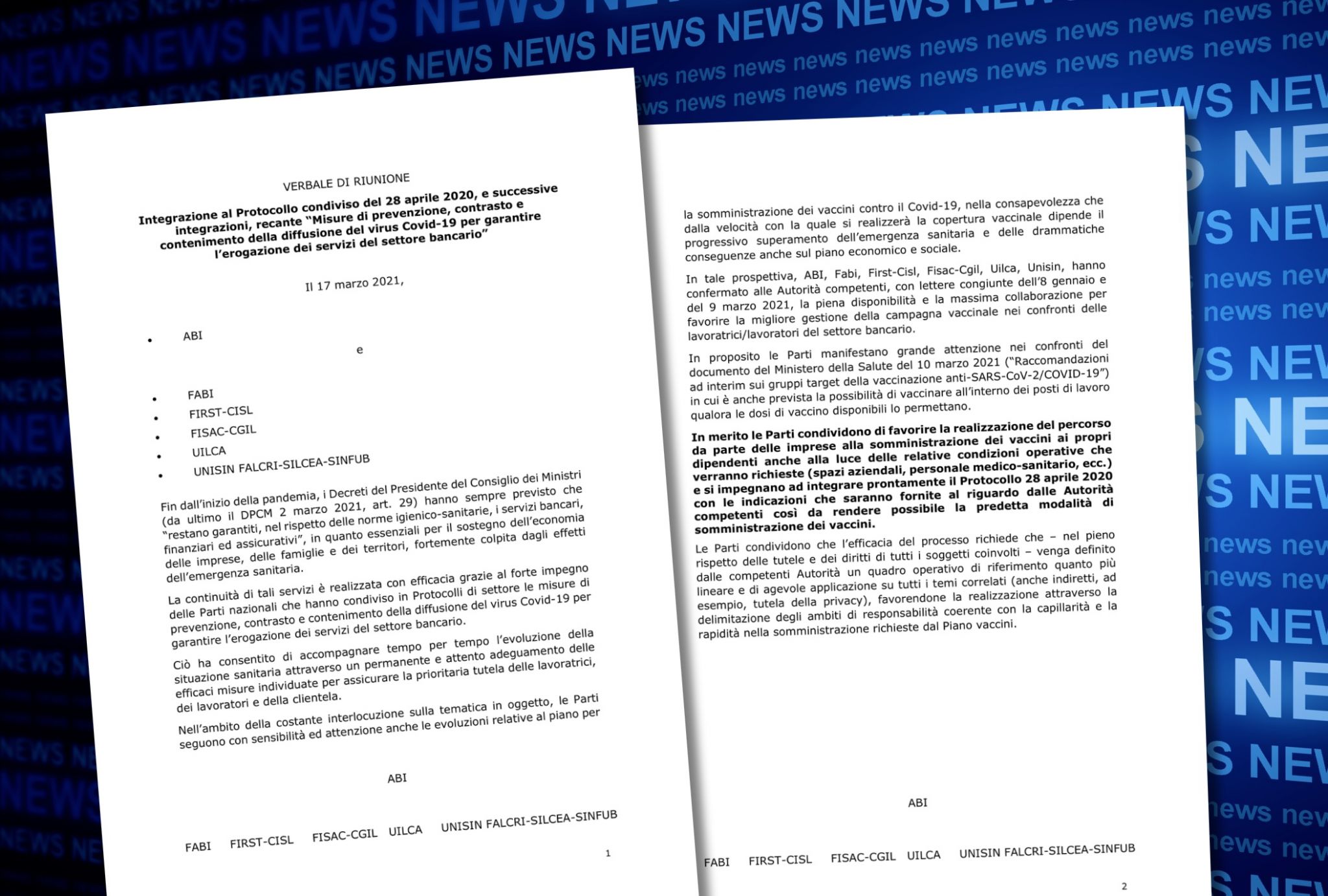Il Verbale di riunione del 17 marzo 2021 firmato da Abi, Fabi, First Cisl, Fisac Cgil, Uilca e Unisin: Integrazione al Protocollo condiviso del 28 aprile 2020, e successive integrazioni, recante “Misure di prevenzione, contrasto e contenimento della diffusione del virus Covid-19 per garantire l’erogazione dei servizi del settore bancario”