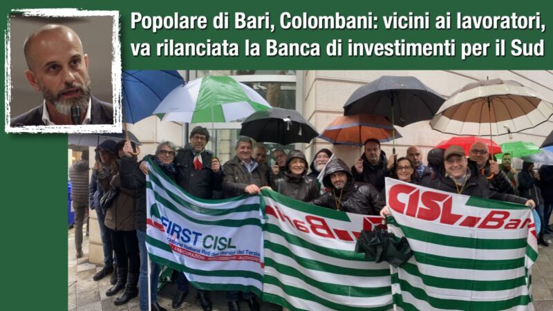 “First Cisl è al fianco delle lavoratrici e dei lavoratori di Popolare di Bari, che oggi sono scesi in sciopero per la prima volta nella storia della banca. Dopo anni di sacrifici, che hanno consentito il salvataggio dell’istituto, è necessario che i temi del salario e dell’organizzazione del lavoro tornino al centro del confronto con i sindacati. Confronto che va però impostato, diversamente da quanto avvenuto nel recente passato, nel quadro di relazioni sindacali improntate al rispetto ed al senso di responsabilità”. Lo dichiara il segretario generale di First Cisl Riccardo Colombani.