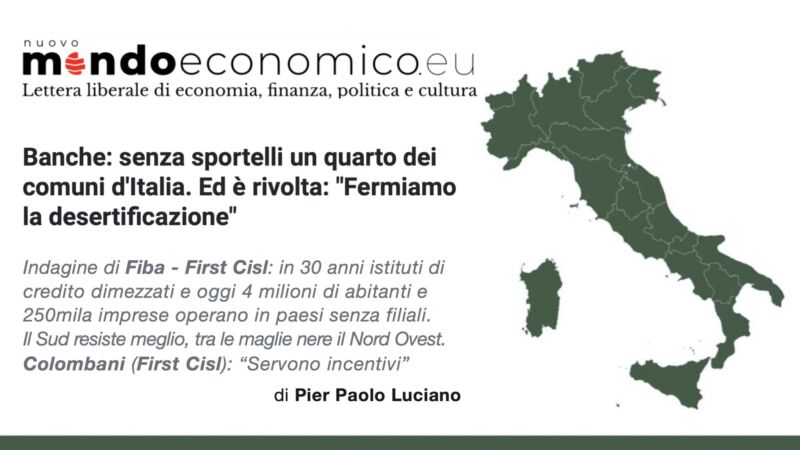 Firma l’articolo il vice direttore del settimanale di economia e finanza, Pier Paolo Luciano, che definisce “agghiaccianti” i numeri rilasciati dal puntuale report trimestrale elaborato dalla Fondazione Fiba. Come riporta Mondo Economico, “più di un quarto dei comuni italiani – 2.227 su 7.901 per la precisione – non ha una banca. Sono 4 milioni e 300mila gli abitanti esclusi da un servizio fondamentale. Oltre la metà ha perso questo diritto negli ultimi anni. E le imprese che operano in questo contesto infelice sono quasi 250mila (negli ultimi dodici mesi sono aumentate di 23mila unità). A conferma di uno stillicidio senza fine”.