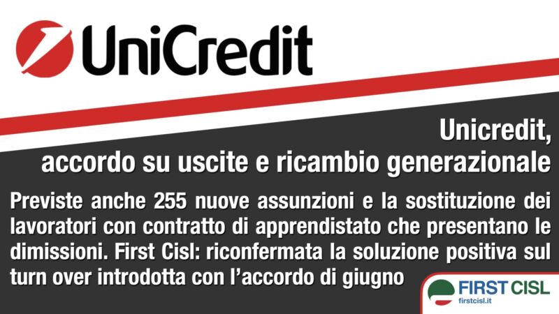 Come da sempre chiesto da First Cisl, insieme agli altri sindacati aziendali del gruppo Unicredit, riguardo all’impegno per la nuova occupazione, sono state concordate 255 nuove assunzioni, alle quali si potranno sommare ulteriori assunzioni fino ad un numero massimo aggiuntivo di 86 per la sostituzione delle dimissioni volontarie nell’arco del piano industriale (fino al 31 dicembre 2024) di giovani con contratto di apprendistato. Nel caso di turn over di apprendisti più elevato, Unicredit provvederà ad ulteriori assunzioni sino ad un massimo di 169. Viene inoltre confermato che il piano di ricambio generazionale terrà poi anche conto delle specificità geografiche, delle aree del Mezzogiorno e delle zone disagiate.