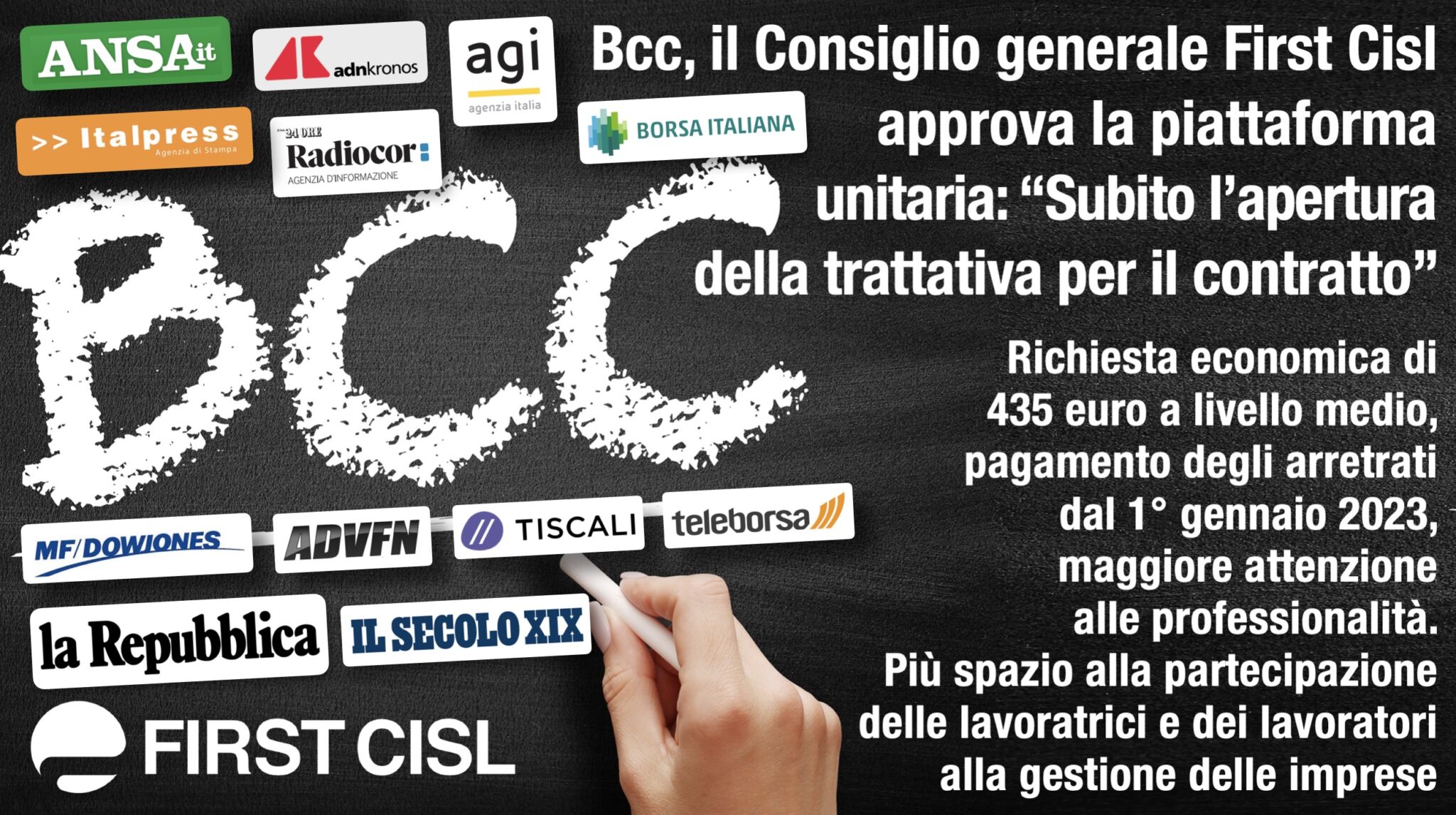 Il Consiglio generale di First Cisl ha approvato la piattaforma unitaria per il rinnovo del contratto nazionale dei 36mila lavoratori del credito cooperativo. La stampa ha dato ampia copertura alle rivendicazioni che saranno oggetto di trattativa. “First Cisl, approvata piattaforma per rinnovo contratto Bcc” è il titolo di Ansa. Stessa impostazione per AdnKronos, Agi e Italpress che nell’ordine scrivono: “Bcc: First Cisl, consiglio generale approva piattaforma unitaria”, “Bcc: First Cisl approva piattaforma rinnovo contratto nazionale”, “Bcc: First Cisl approva piattaforma per rinnovo contratto nazionale”.
