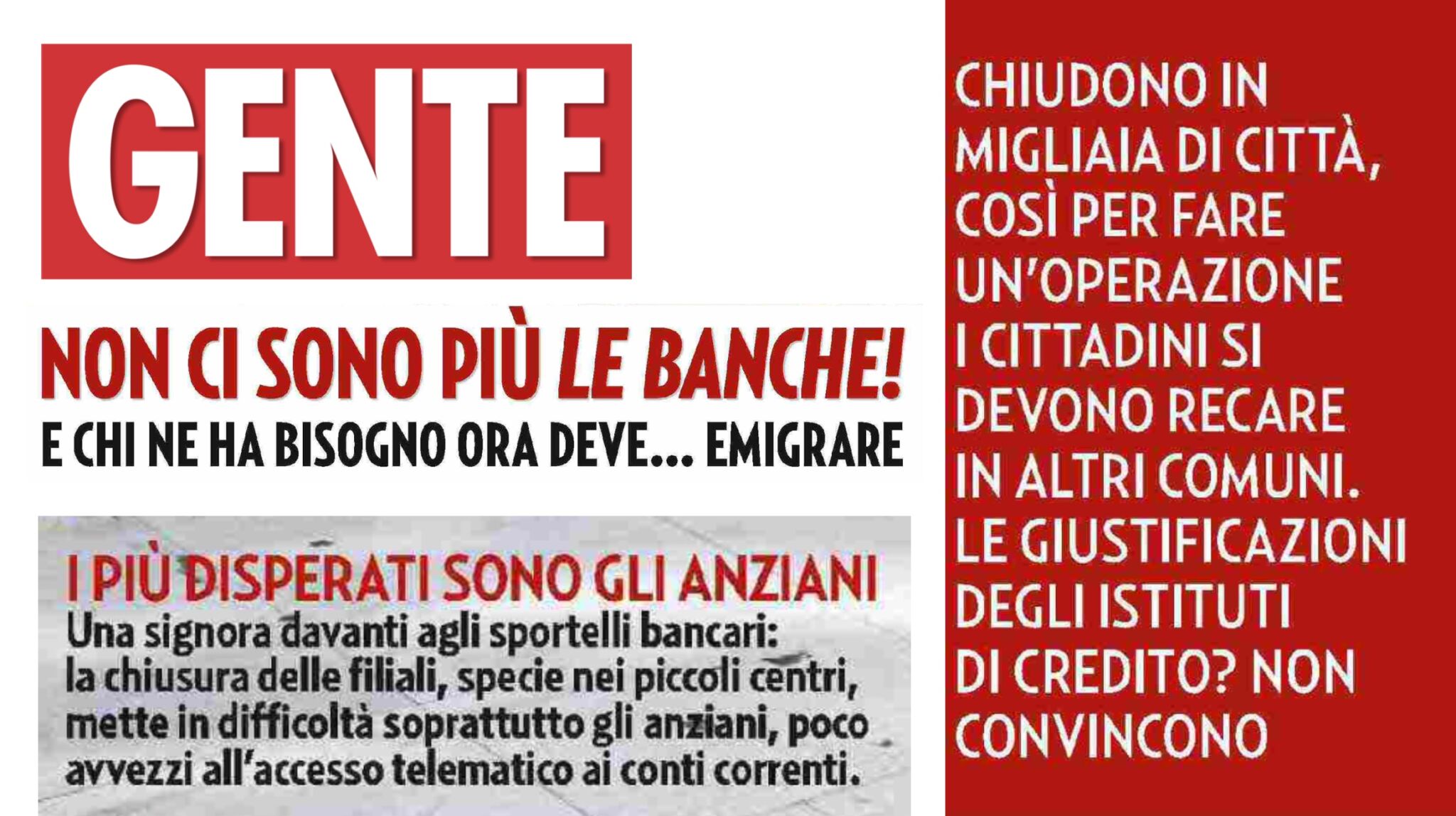 Per Gente “c’è un’Italia di serie B, composta secondo i dati diffusi di recente dall’Osservatorio del sindacato dei lavoratori del settore finanziario First Cisl da 4milioni e 373mila cittadini e 255mila aziende, perlopiù piccole e medie, che un brutto giorno ha trovato al posto dell’agenzia di fiducia un centro benessere, una palestra o un bar. I più penalizzati sono i comuni della Calabria e del Molise dove la mannaia delle chiusure si è abbattuta con più prepotenza. Ma la moria di agenzie ha riguardato, più o meno, tutte le regioni da nord a sud del Paese, e sul totale dei 7.900 comuni che si contano sul nostro territorio nazionale, ben 3.278, quasi la metà, oggi non hanno neanche uno sportello bancario”.