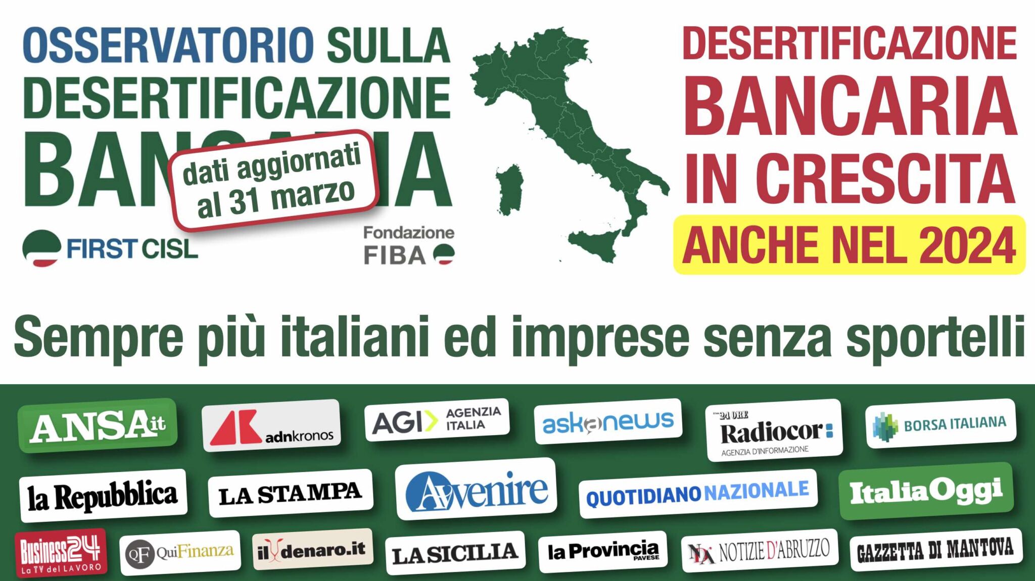 “First Cisl, aumentano i comuni senza una filiale bancaria” titola Ansa evidenziando che il “taglio degli sportelli” fa crescere l’esclusione sociale. Per Agi “Banche: First Cisl, un quarto del territorio privo di sportelli”. Sulla stessa linea AdnKronos, “Banche: First Cisl, desertificazione aumenta nel 1° trimestre, un quarto del territorio privo di sportelli”, e Askanews, “Banche, Firt Cisl: un quarto d’Italia senza filiali, in 10mln a rischio”. Anche per Il Sole 24 Ore Radiocor “aumentano i comuni desertificati nel primo trimestre” rimarcando che “nei primi 3 mesi del 2024 chiusi altri 97 sportelli”. Borsa Italiana rilancia la nota dell’agenzia de Il Sole 24 ore scrivendo “First Cisl, aumentano i comuni senza una filiale bancaria”. La giornalista Rosaria Amato sul quotidiano la Repubblica sottolinea nel titolo del suo articolo che “mentre gli sportelli bancari continuano a chiudere anche gli utili delle banche volano”. La Stampa mette assieme i dati dell’analisi dell’Osservatorio First Cisl sulla desertificazione bancaria e quelli del rapporto mensile dell’Abi evidenziando che diminuiscono sì i tassi dei mutui ma “solo quelli fissi” mentre “i comuni senza sportelli sono più del 41%”. Anche Avvenire confronta i due report scrivendo che “I tassi dei mutui proseguono nella loro lenta discesa. Ma il trend vale soprattutto per quelli fissi, mentre i contratti variabili attendono ancora i tagli al costo del denaro attesi dalla Bce (…) Intanto ieri First Cisl ha aggiornato il conteggio sui comuni rimasti senza filiale: sono sette in più nel primo trimestre, a quota 3.282, il 41,5% del totale dei comuni italiani”.