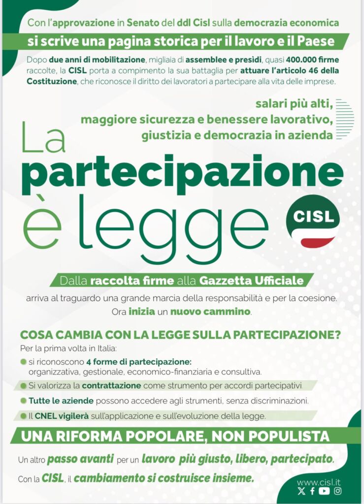 “Una lunga marcia che ha visto la Cisl raccogliere quasi 400.000 adesioni in tutte le regioni, nei luoghi di lavoro, nelle piazze, nei territori. Un cammino della responsabilità che ha fatto emergere con forza il valore popolare e antipopulista di questa riforma: una risposta democratica ai bisogni veri delle persone, verso un’innovazione che guarda al futuro e non al passato, lontana da ogni sterile ideologismo e demagogia – prosegue Fumarola – Questa legge rappresenta una svolta culturale oltre che normativa. Per la prima volta il legislatore riconosce la partecipazione non come opzione astratta, ma come motore concreto capace di rilanciare salari, produttività, sicurezza e benessere lavorativo, legalità e giustizia sociale”.