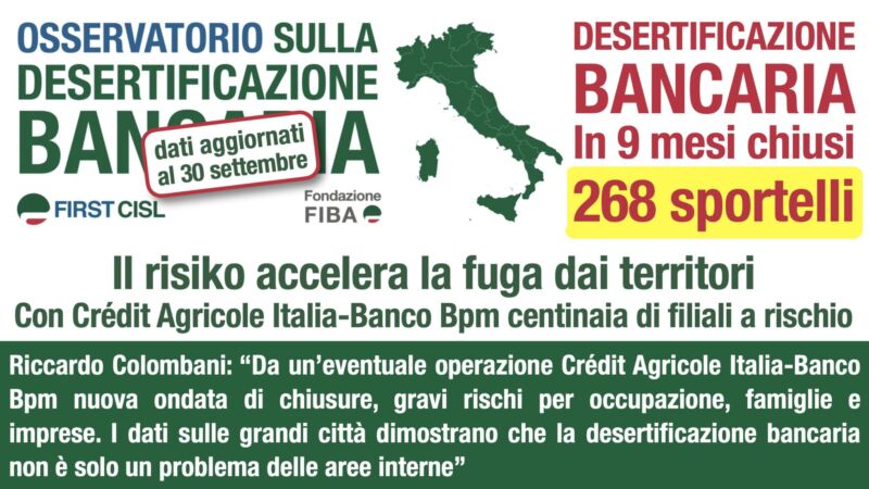 Nei primi nove mesi dell’anno altri 268 sportelli chiusi. Basilicata, Marche e Veneto le regioni più colpite. Sale a 3.419 il numero dei comuni privi di filiale: sono il 43,3% del totale. E con il risiko il ritmo delle chiusure è destinato ad aumentare ancora. Dopo l’acquisizione di Popolare di Sondrio, Bper ha annunciato l’accorpamento di 90 sportelli. Ma il conto potrebbe essere molto più salato se si concretizzasse l’integrazione tra le reti di Banco Bpm e Crédit Agricole Italia. Lombardia, Liguria ed Emilia Romagna rischiano i tagli più pesanti. Colombani: “Da un’eventuale operazione Crédit Agricole Italia-Banco Bpm nuova ondata di chiusure, gravi rischi per occupazione, famiglie e imprese. I dati sulle grandi città dimostrano che la desertificazione bancaria non è solo un problema delle aree interne”