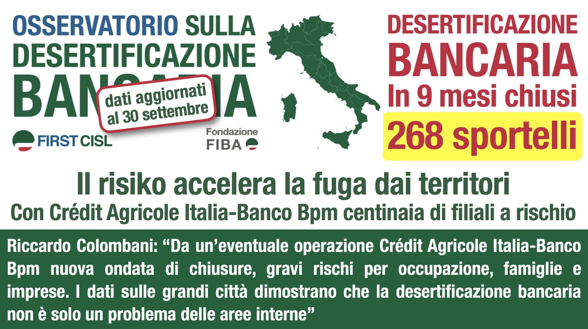 Nei primi nove mesi dell’anno altri 268 sportelli chiusi. Basilicata, Marche e Veneto le regioni più colpite. Sale a 3.419 il numero dei comuni privi di filiale: sono il 43,3% del totale. E con il risiko il ritmo delle chiusure è destinato ad aumentare ancora. Dopo l’acquisizione di Popolare di Sondrio, Bper ha annunciato l’accorpamento di 90 sportelli. Ma il conto potrebbe essere molto più salato se si concretizzasse l’integrazione tra le reti di Banco Bpm e Crédit Agricole Italia. Lombardia, Liguria ed Emilia Romagna rischiano i tagli più pesanti. Colombani: “Da un’eventuale operazione Crédit Agricole Italia-Banco Bpm nuova ondata di chiusure, gravi rischi per occupazione, famiglie e imprese. I dati sulle grandi città dimostrano che la desertificazione bancaria non è solo un problema delle aree interne”