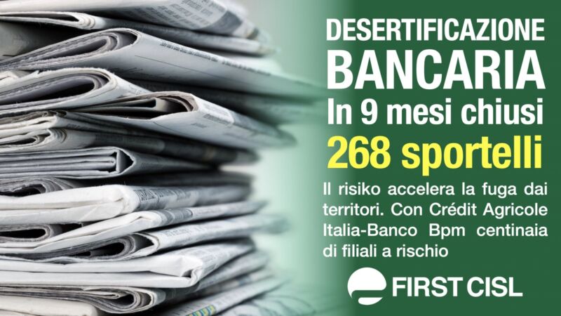 “No della First Cisl a Bpm-Credit Agricole, occupazione a rischio” titola Ansa. Stessa impostazione per Askanews: “First Cisl: no deciso aggregazione Credit Agricole Italia-Bpm, gravi rischi occupazione”. Per AdnKronos “Banche: First Cisl, in 9 mesi chiusi 268 sportelli, risiko accelera fuga dai territori”. Anche per Italpress “Chiusi 268 sportelli da inizio anno, risiko accelera fuga dai territori”. Nel rilanciare una nota de Il Sole 24 Ore Radiocor, Borsa Italiana scrive: “Banche: First Cisl, in 9 mesi altri 268 sportelli chiusi, risiko aumenta chiusure”.