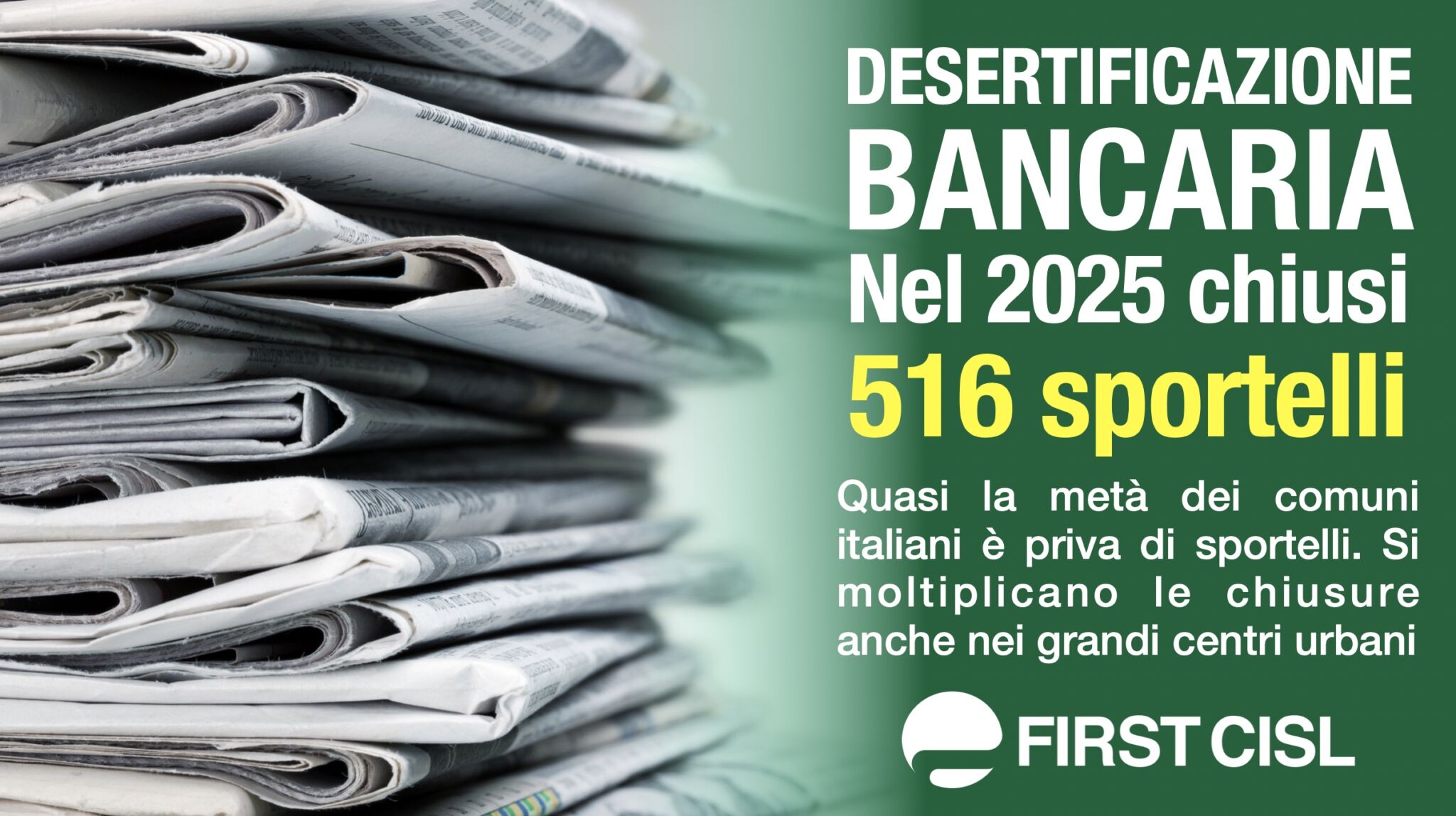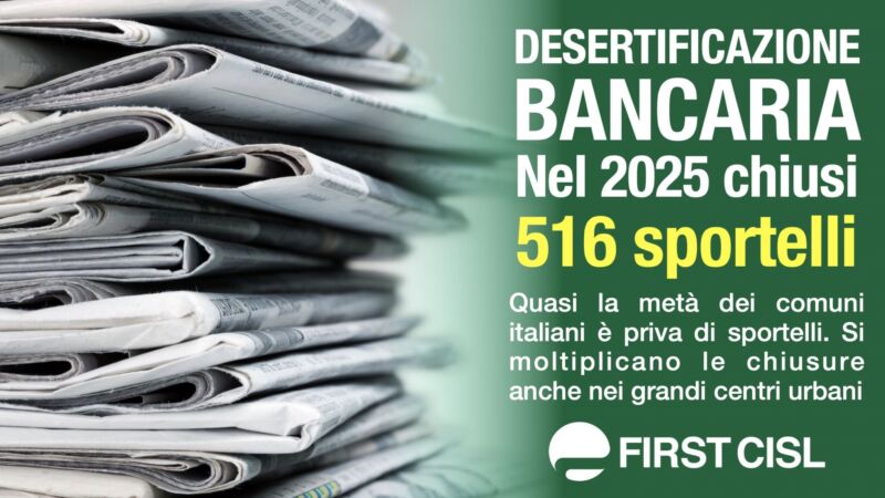La rassegna stampa continua con Economy e Investire: “First Cisl: “Desertificazione bancaria, nel 2025 chiusi 516 sportelli e quasi metà dei comuni resta senza filiali” è il titolo del servizio. “Banche, Iccrea primo gruppo per presenza sul territorio” fa notare Wall Street Italia. Sulla stessa linea Advisoronline e il Nord Est e Avvertenze Aduc.it che nell’ordine titolano “Gruppo Iccrea, prima per numero di sportelli in Italia” e “Banche, chiusi 516 sportelli. Iccrea prima per presenze”. Il Diario del Lavoro evidenzia che “l’internet banking non compensa” la chiusura di altri 516 sportelli. Per Live Sicilia “Avanza la desertificazione bancaria: chiusi 516 sportelli in un anno”. Di autentica “Ecatombe di sportelli nel 2025” scrive Moneta Web avvertendo che “è sos desertificazione bancaria anche nelle città”. “Sportelli in fuga: l’Italia che perde la propria rete bancaria” rimarca Notizieit. Anche Giornale La Voce rileva la fuga delle banche dai territori con “sportelli chiusi e milioni di italiani esclusi mentre il digitale non basta”. Per SimplyBiz “Desertificazione bancaria, First Cisl: chiusi altri 516 sportelli nel 2025. Colombani: «Modesto incremento nell’uso dei canali digitali non giustifica le chiusure»”.