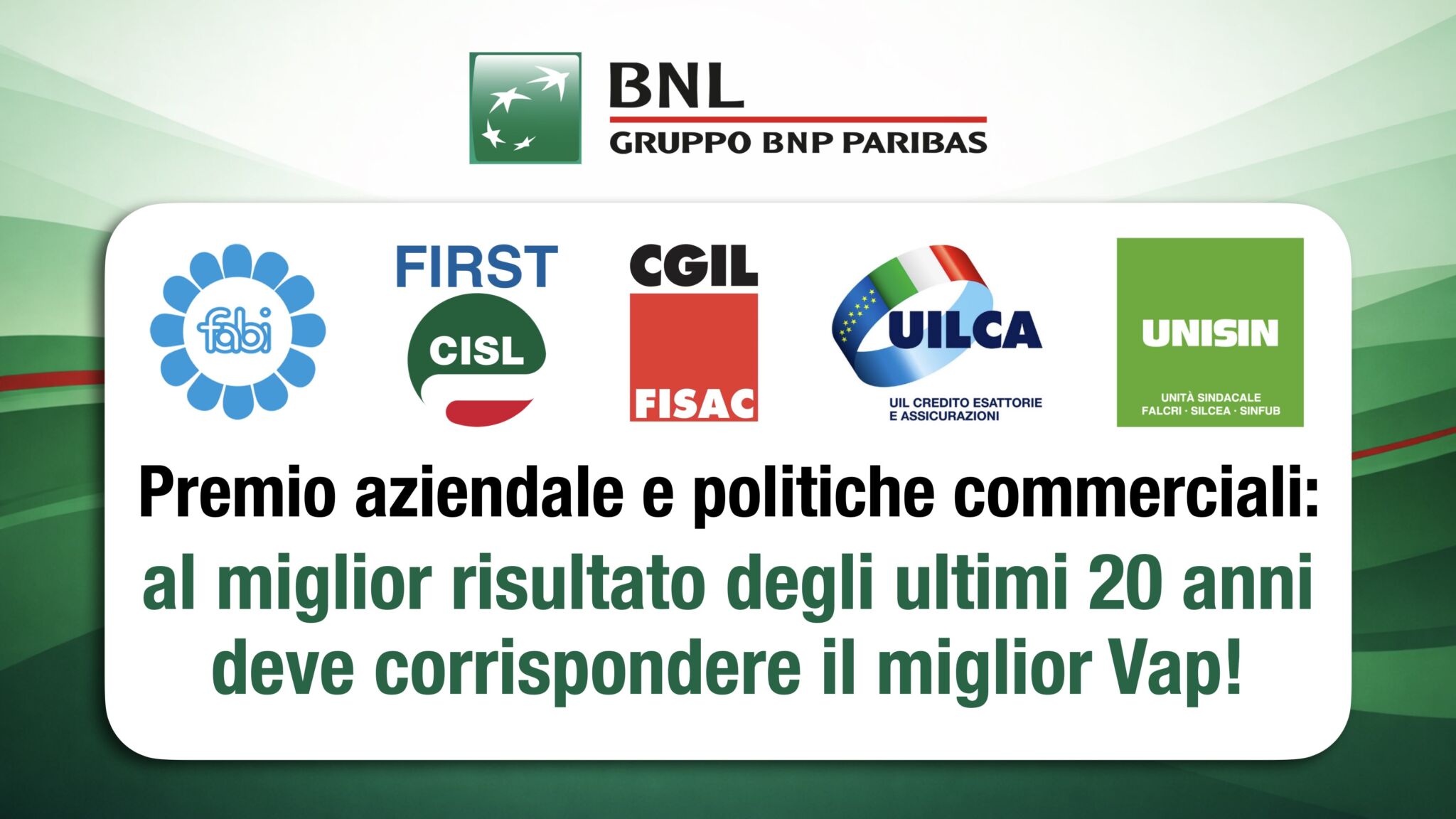 Di seguito il comunicato unitario delle Segreterie di coordinamento Gruppo Bnl di Fabi, First Cisl, Fisac Cgil, Uilca e Unisin: