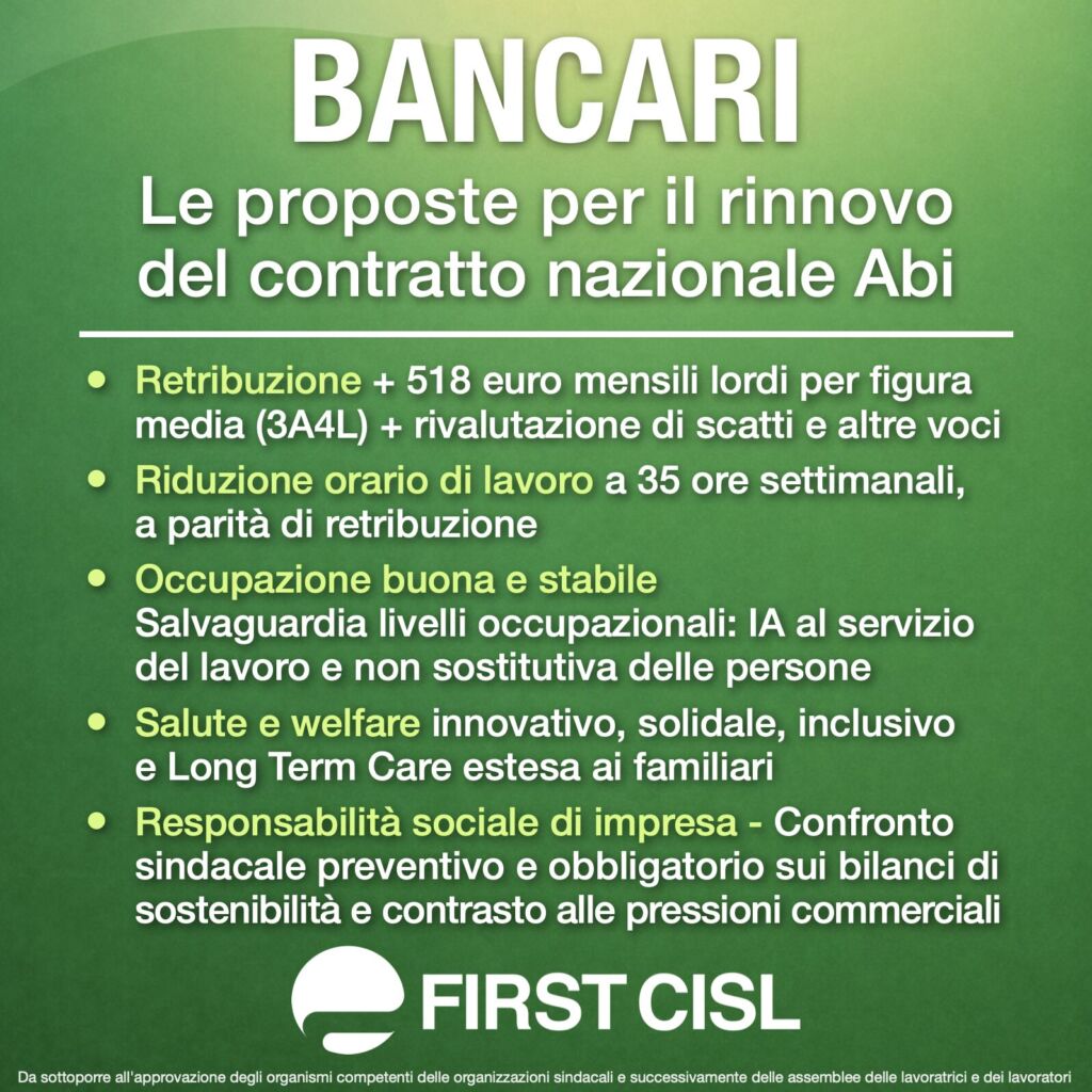 “L’aumento di 518 euro lordi mensili per la figura di riferimento, il correlato aumento degli scatti di anzianità e delle indennità, sono indispensabili per mantenere il potere d’acquisto, sulla base delle attuali previsioni di inflazione del triennio 2026-2028, e per redistribuire l’enorme valore prodotto dalle lavoratrici e dai lavoratori”. Lo dichiara il Segretario generale nazionale First Cisl Riccardo Colombani a seguito dell’approvazione della piattaforma unitaria di rivendicazione per il rinnovo del Contratto collettivo nazionale di lavoro del settore creditizio e finanziario da parte delle Segreterie nazionali delle organizzazioni sindacali.