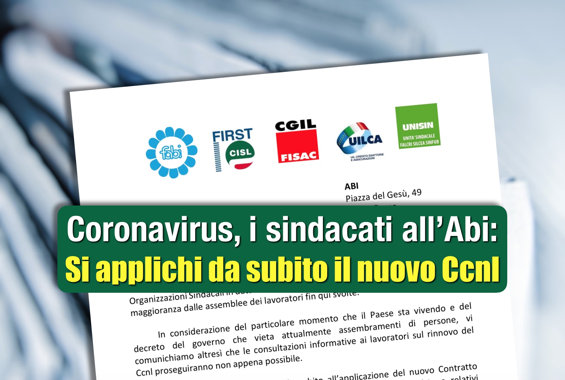 Coronavirus, i sindacati all’Abi, si applichi da subito il nuovo CCNL Banche 5 Marzo 2020 Clicca Qui per la lettera unitaria inviata all’Abi dai segretari generali di Fabi, First Cisl, Fisac Cgil, Uilca e Unisin.