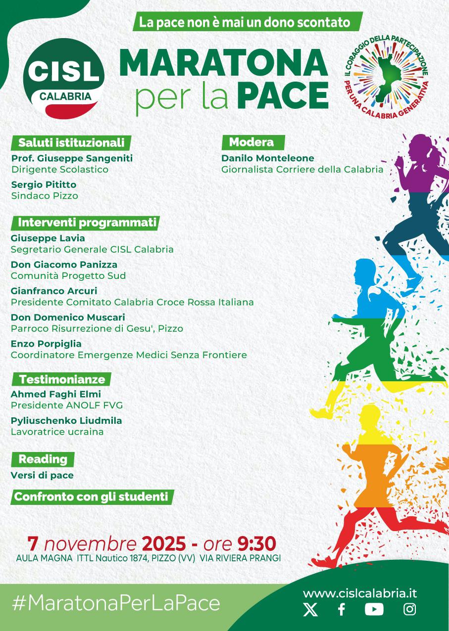 iolenze, la Cisl sceglie di mobilitarsi per dire no ad ogni conflitto – ha detto nel suo intervento il Segretario generale Cisl Calabria, Giuseppe Lavia – attraverso la Maratona per la Pace e tramite azioni concrete, come la raccolta fondi per la popolazione di Gaza. In un contesto di guerra mondiale a pezzi, un mondo dove le alleanze si sgretolano e i conflitti si moltiplicano, il prezzo, umano ed economico, lo pagano soprattutto i più vulnerabili. Come Cisl vogliamo tessere fili dell’ascolto e del dialogo, perché anche i nemici possano riconciliarsi, per contribuire, come scriveva Giorgio La Pira, ad una storia diversa del mondo, la storia dell’età negoziale.”