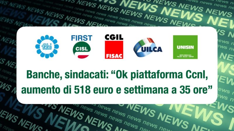 I Segretari generali di Fabi, First Cisl, Fisac Cgil, Uilca e Unisin, Lando Maria Sileoni, Riccardo Colombani, Susy Esposito, Fulvio Furlan ed Emilio Contrasto, hanno approvato la piattaforma rivendicativa per il rinnovo del Contratto collettivo nazionale di lavoro del settore bancario, che sarà ora sottoposta al voto delle lavoratrici e dei lavoratori bancari nelle assemblee.