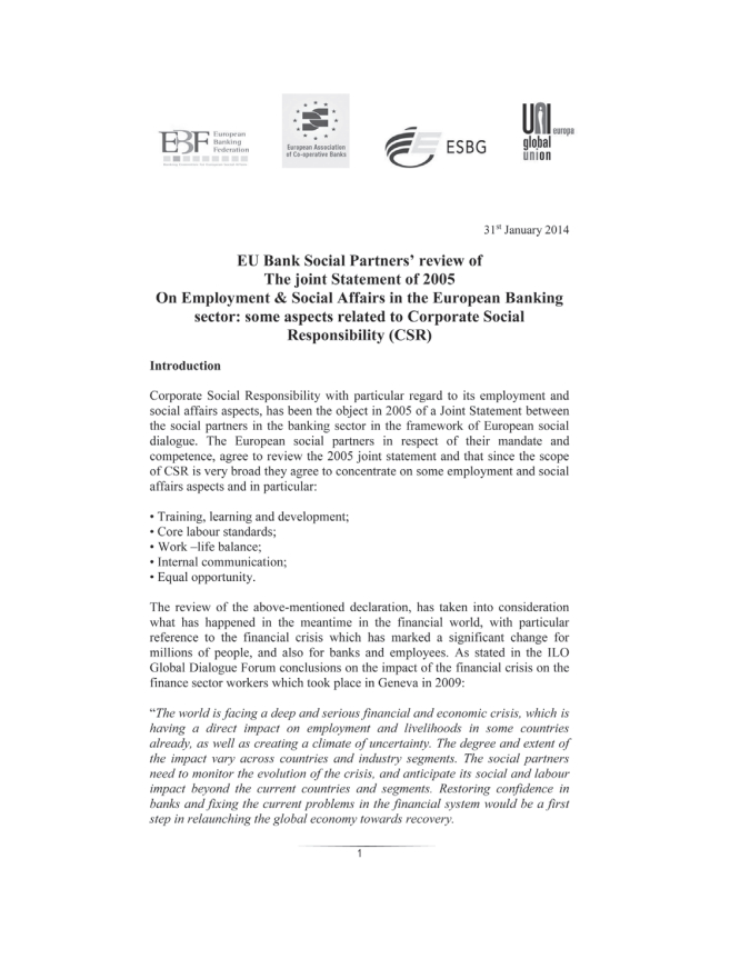 Appendice 9 – Dichiarazione congiunta delle Parti sociali europee del settore bancario sulla responsabilità sociale d’impresa del gennaio 2014