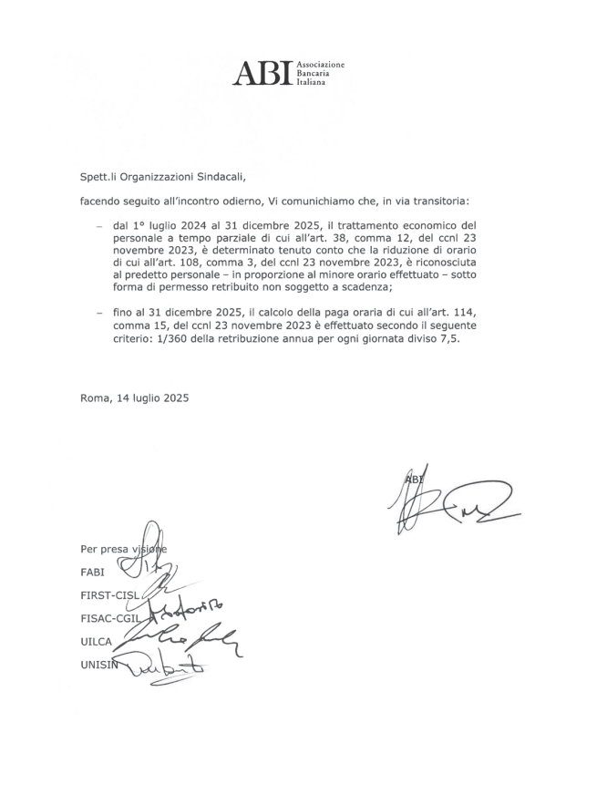 Lettera di ABI alle Organizzazioni Sindacali del 14 luglio 2025