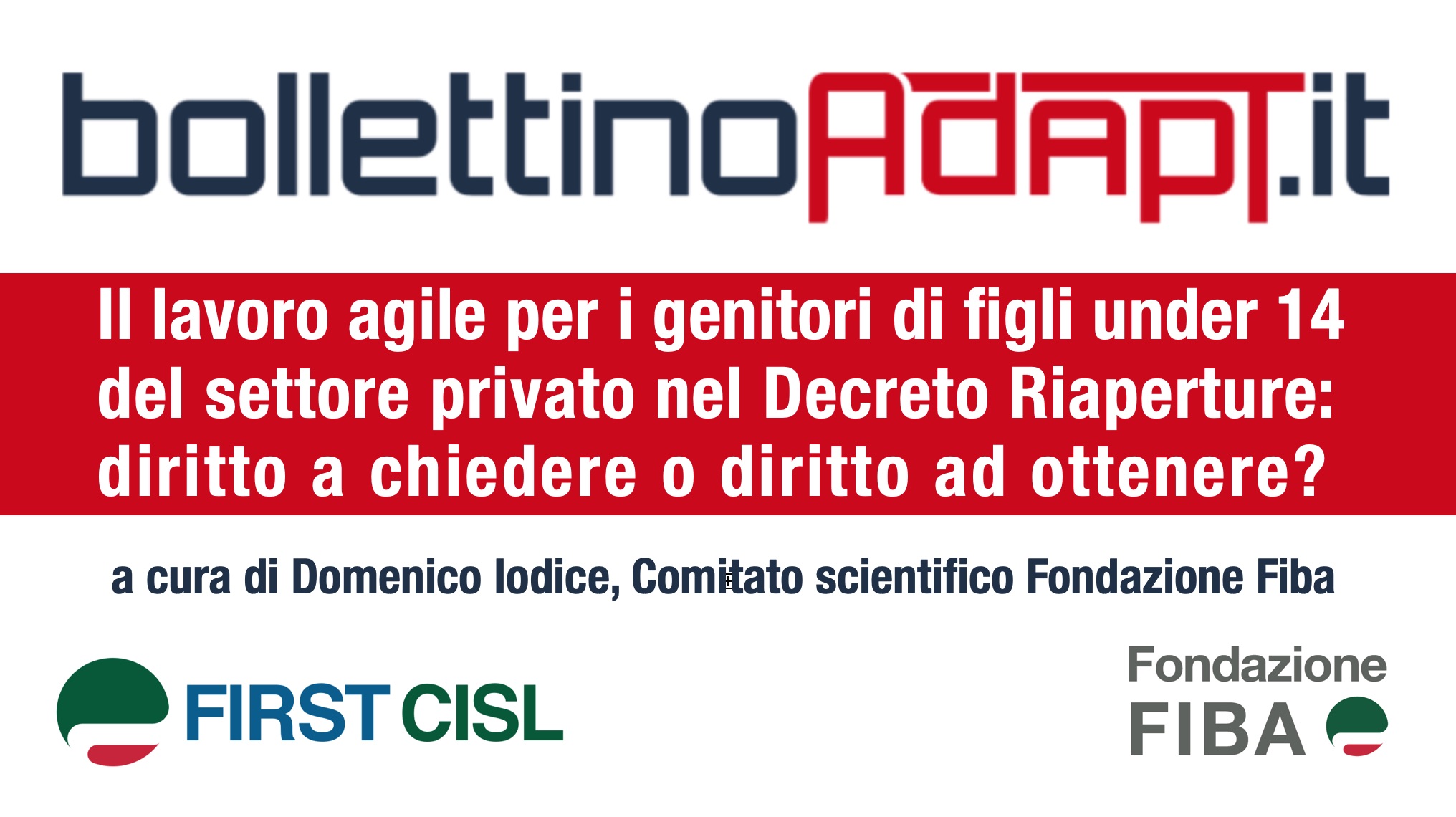 “Il lavoro agile per i genitori di figli under 14 del settore privato nel Decreto Riaperture: diritto a chiedere o diritto ad ottenere?” è il titolo dell’approfondimento, pubblicato da Adapt, a cura di Domenico Iodice, giuslavorista, membro del Comitato scientifico Fondazione Fiba e responsabile del settore C.A.First.