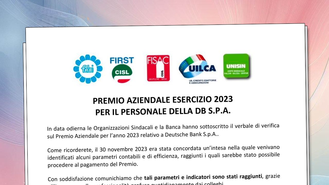 In data odierna le Organizzazioni sindacali e la banca hanno sottoscritto il verbale di verifica sul Premio aziendale per l’anno 2023 relativo a Deutsche Bank S.p.A..