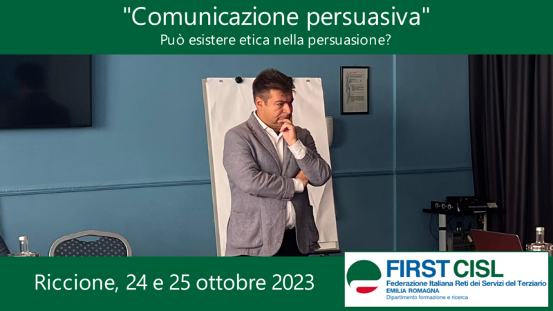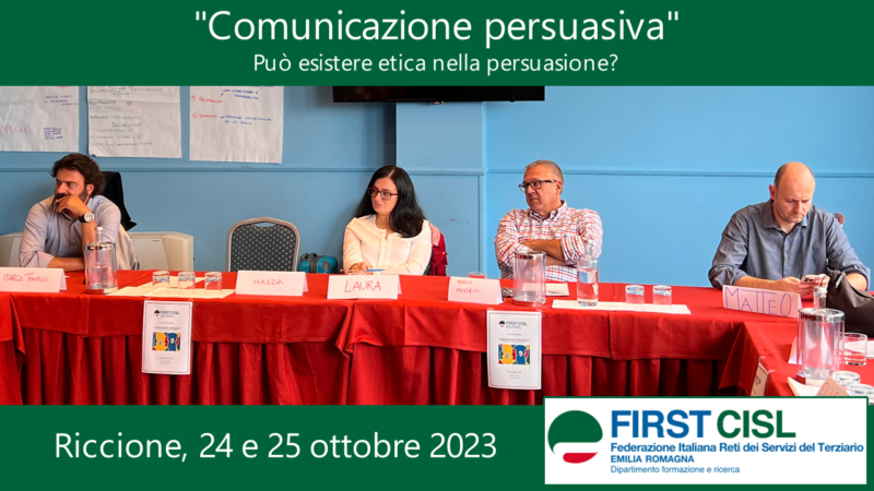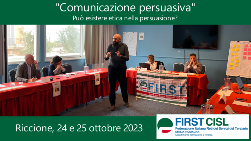 Si è concluso ieri pomeriggio il corso “Comunicazione persuasiva – Può esistere etica nella persuasione?”, organizzato dal Dipartimento formazione e ricerca di First Cisl Emilia Romagna per la comunità formativa RSA Alte Professionalità della nostra regione. Le giornate sono inserite nel percorso formativo rivolto a questo specifico target iniziato in gennaio 2023 con il corso “Comunicare bene nel conflitto: il conflitto come competenza relazionale”, con la docenza di Francesca Rizzi.