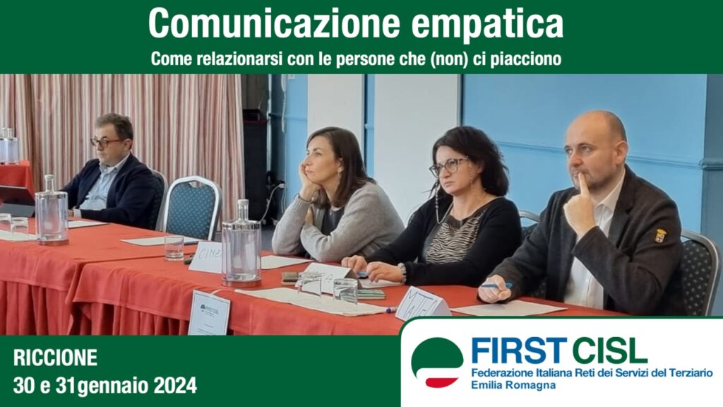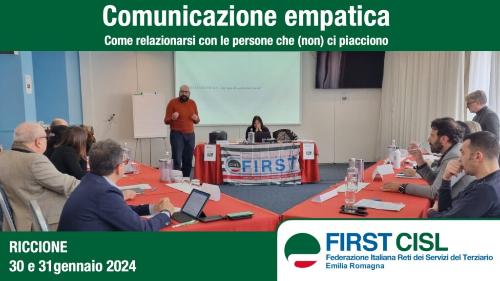 Nei giorni 30 e 31 gennaio 2024 si è svolto a Riccione l’incontro di chiusura del percorso intensivo di First Cisl Emilia Romagna dal titolo “Comunicazione empatica – Come relazionarsi con le persone che (non) ci piacciono” rivolto a sindacaliste e sindacalisti dediti con particolare attenzione alle “Alte professionalità”. Il modulo, organizzato dal Dipartimento formazione e ricerca regionale, è stato affidato alla docenza di Francesca Rizzi e ha visto la partecipazione di Mauro Fanan, responsabile nazionale del settore DirFirst.