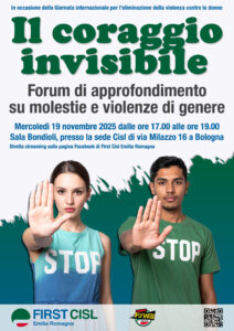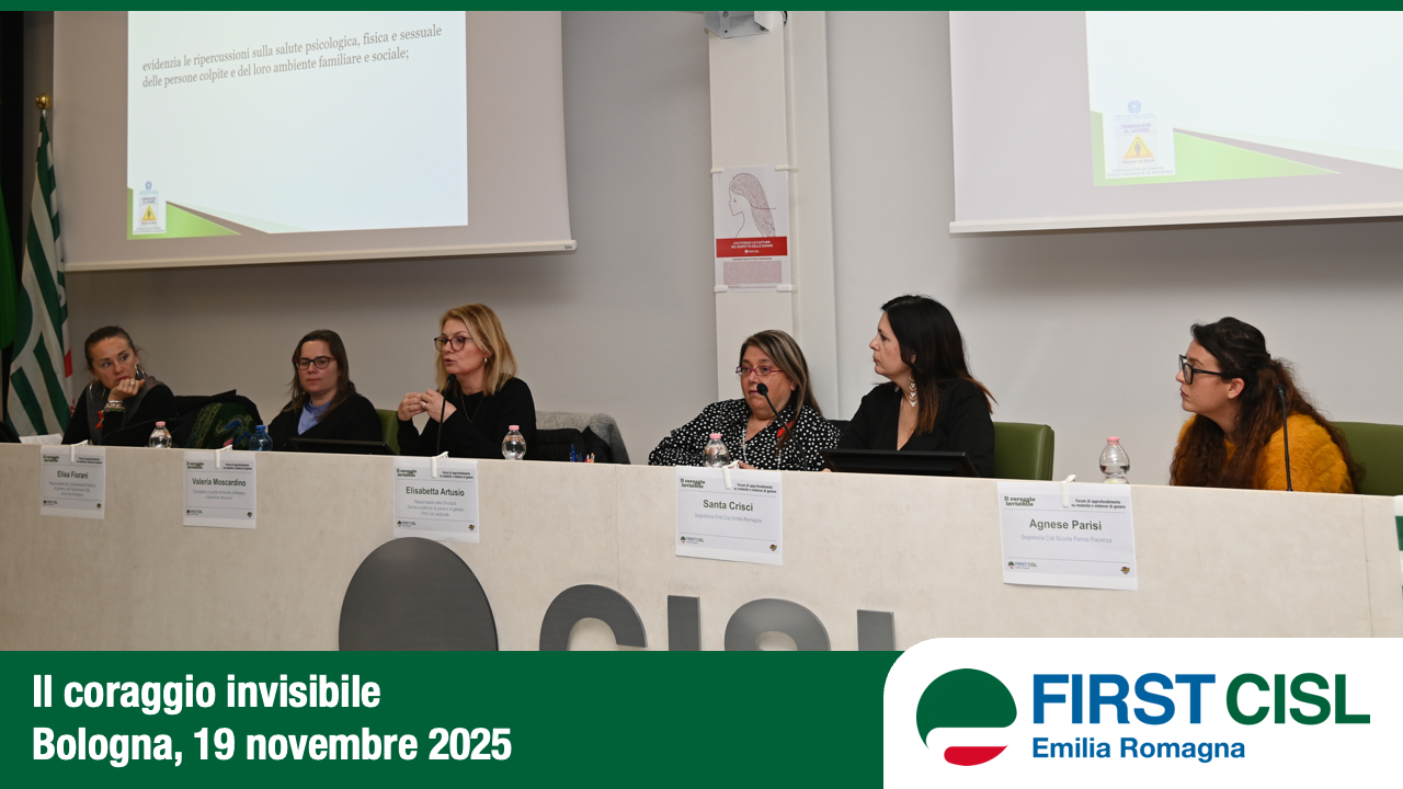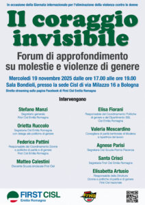 Lo scorso 19 novembre 2025, nella cornice della Sala Bondioli della sede Cisl Emilia Romagna a Bologna, si è tenuto il forum di approfondimento su molestie e violenze di genere organizzato da First Cisl Emilia Romagna dal titolo “Il coraggio invisibile”.