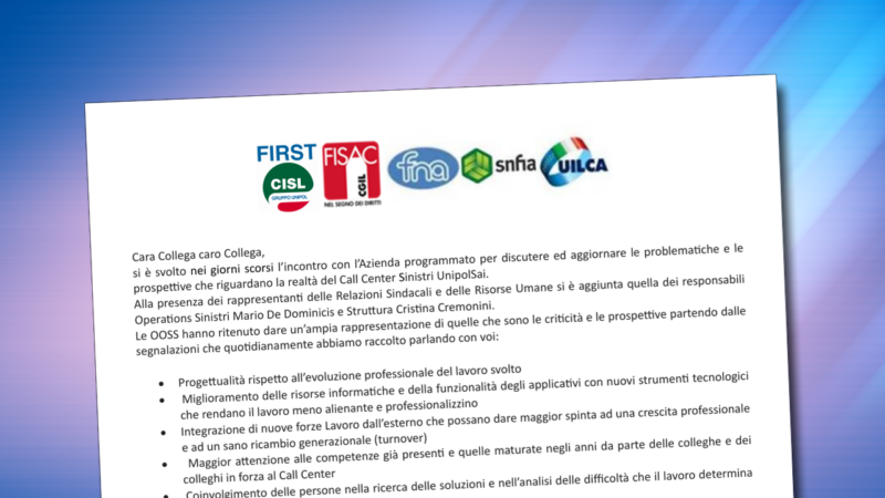 si è svolto nei giorni scorsi l’incontro con l’Azienda programmato per discutere ed aggiornare le problematiche e le prospettive che riguardano la realtà del Call Center Sinistri UnipolSai.