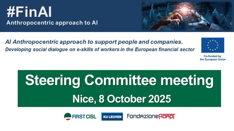 Proseguono spediti i lavori del progetto europeo “#FinAI – Approccio antropocentrico all’intelligenza artificiale, coordinato da First Cisl,  che mira a  promuovere un approccio all’intelligenza artificiale centrato sulla persona, a rafforzare le competenze delle lavoratrici e dei lavoratori del settore finanziario e a valorizzare il ruolo del dialogo sociale e lo sviluppo di buone pratiche in tutta Europa.