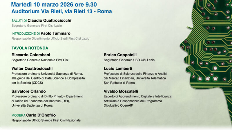 Martedì 10 marzo – presso l’Auditorium Via Rieti, si terrà la tavola rotonda organizzata da First Cisl Lazio dal titolo IA, è davvero intelligenza? a cui parteciperanno: