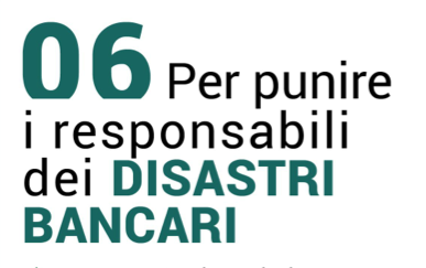 – istituzione del reato di disastro bancario con specifiche aggravanti per i danni che i top manager responsabili dei dissesti delle banche procurano all’occupazione e al risparmio privato;