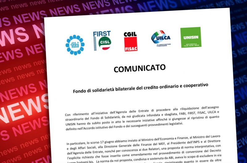 Con riferimento all’iniziativa dell’Agenzia delle Entrate di procedere alla riliquidazione dell’assegno straordinario del Fondo di Solidarietà, da noi giudicata infondata e sbagliata, FABI, FIRST, FISAC, UILCA e UNISIN hanno da subito posto in atto le necessarie iniziative affinché si giungesse al ripristino di quanto definito nell’Accordo istitutivo del Fondo e dei susseguenti provvedimenti legislativi.