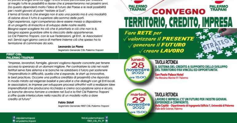 Territorio Credito Impresa: fare rete per valorizzare il presente, generare il futuro e creare lavoro”. Due giorni di dibattito organizzati a Palermo dalla Cisl e dalla First Cisl Palermo…