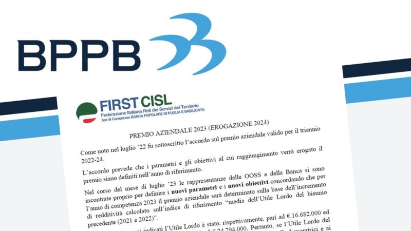 E’ datato 1° settembre l’accordo sindacale che definisce nuovi parametri e obiettivi per determinare il premio aziendale dell’anno in corso per le lavoratrici e i lavoratori della Banca Popolare di Puglia e Basilicata.