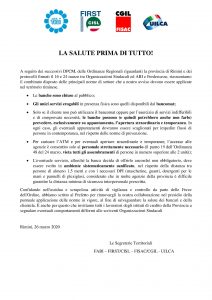 A seguito dei successivi DPCM, delle Ordinanze Regionali riguardanti la provincia di Rimini e dei protocolli firmati il 16 e 24 marzo tra Organizzazioni Sindacali ed ABI e Ferdercasse, riassumiamo il combinato disposto delle principali norme di settore che a nostro avviso devono essere applicate nel territorio riminese.