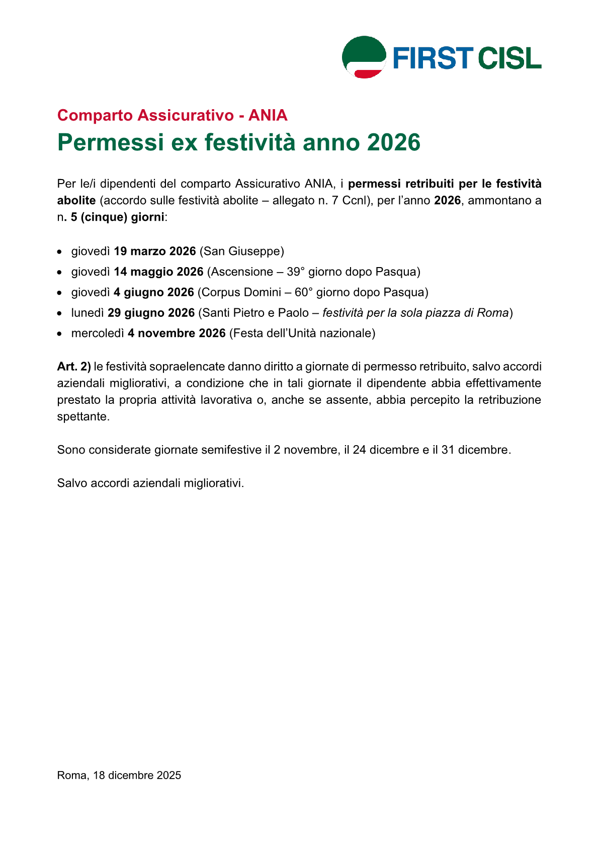 2026 Permessi ex fesitvità comparto ANIA