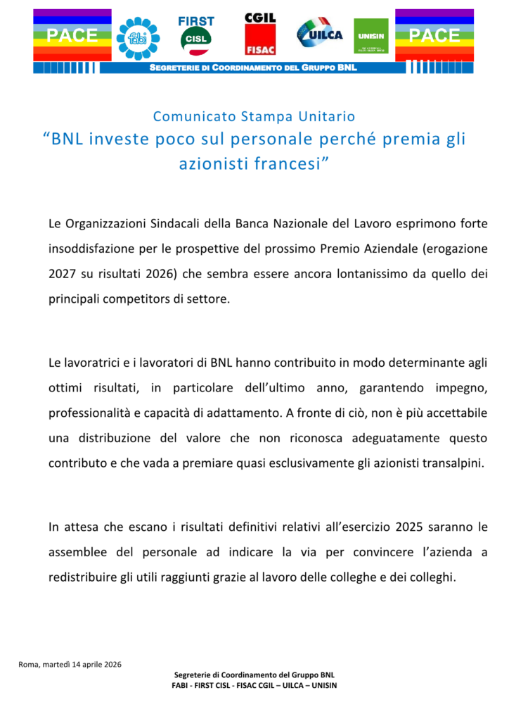 Le lavoratrici e i lavoratori di Bnl hanno contribuito in modo determinante agli ottimi risultati, in particolare dell’ultimo anno, garantendo impegno, professionalità e capacità di adattamento. A fronte di ciò, non è più accettabile una distribuzione del valore che non riconosca adeguatamente questo contributo e che vada a premiare quasi esclusivamente gli azionisti transalpini.