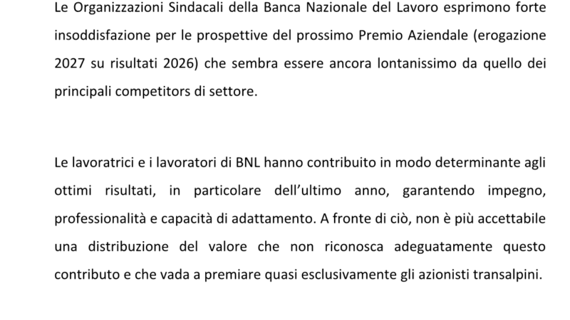 Le organizzazioni sindacali della Banca Nazionale del Lavoro esprimono forte insoddisfazione per le prospettive del prossimo Premio aziendale (erogazione 2027 su risultati 2026) che sembra essere ancora lontanissimo da quello dei principali competitor di settore.