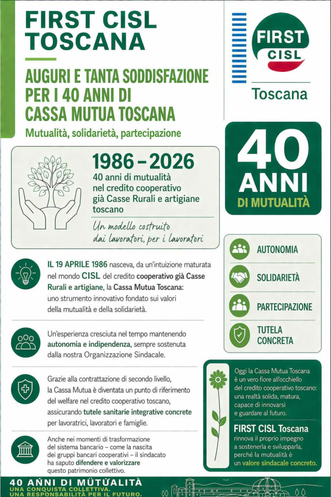 40 anni fa nasceva da un’intuizione nel mondo CISL del Credito Cooperativo, la Cassa Mutua Toscana: uno strumento innovativo fondato sui valori della mutualità e solidarietà. Un’esperienza cresciuta nel tempo mantenendo AUTONOMIA e INDIPENDENZA, sempre sostenuta dalla nostra Organizzazione Sindacale CISL.