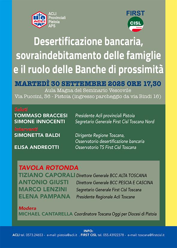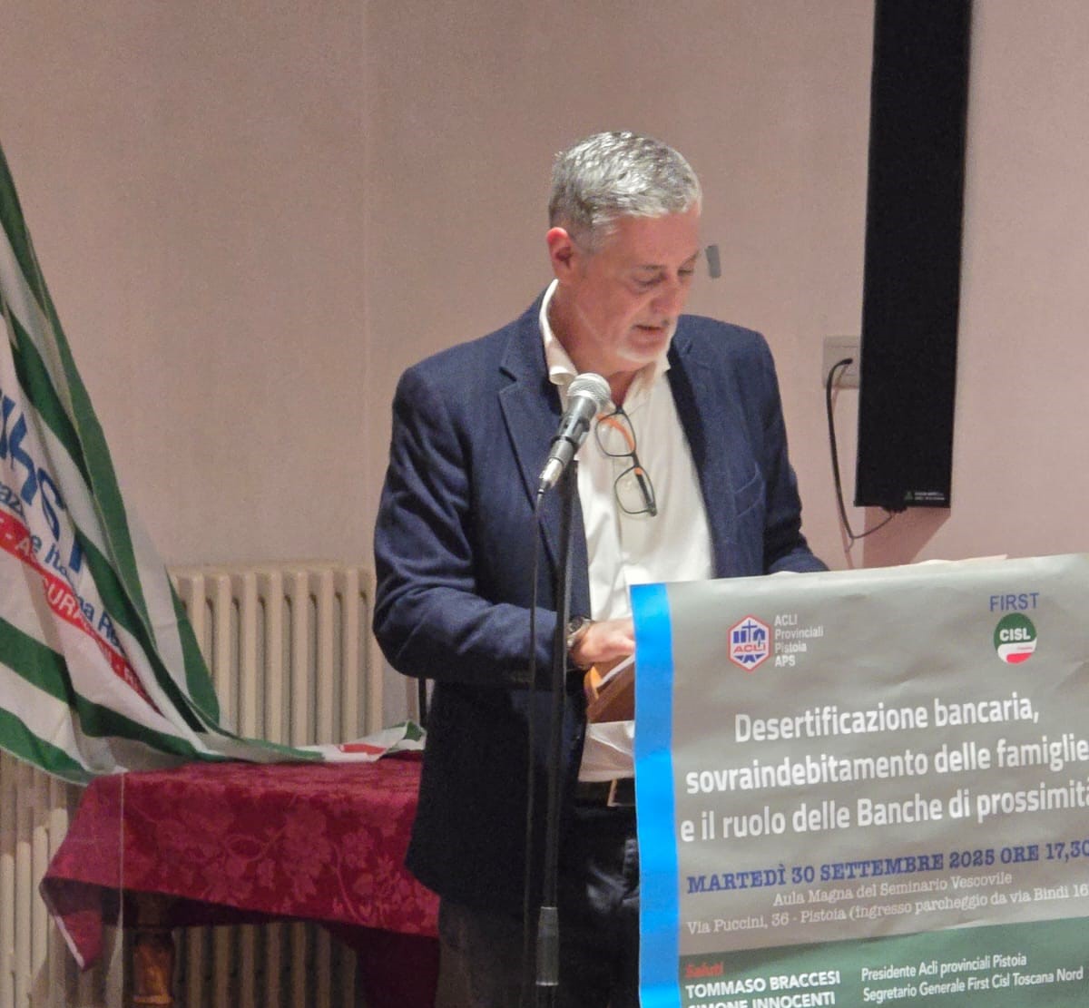 Si è svolta martedì 30 settembre, presso l’Aula Magna del Seminario Vescovile di Pistoia, la tavola rotonda organizzata da First Cisl Toscana ed Acli Pistoia dal titolo “Desertificazione bancaria, sovraindebitamento delle famiglie e ruolo delle Banche di prossimità”.