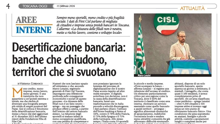 I numeri preoccupanti della desertificazione bancaria in Toscana, 31 comuni privi di sportelli con 56.000 abitanti e 3.600 imprese senza un presidio bancario fisico, sono al centro dell’intervista al Segretario generale First Cisl Toscana Marco Lenzini. “La chiusura delle filiali non è un fatto neutro ma un passaggio che produce effetti a catena, a partire dall’interno del settore bancario stesso” ha spiegato  Lenzini. Le conseguenze della riduzione degli sportelli si traducono in: meno occupazione qualificata, perdita di competenze e professionalità  che impoverisce non solo il sistema del credito ma l’intero tessuto territoriale.